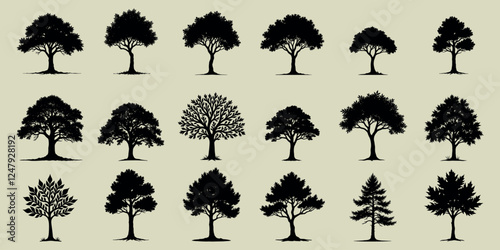 detailed tree silhouette collection, hand-drawn nature tree vector pack, botanical trees in sketch style