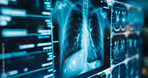 Detailed view of a digital lung scan highlighting respiratory structures and potential health issues in a medical examination setting
