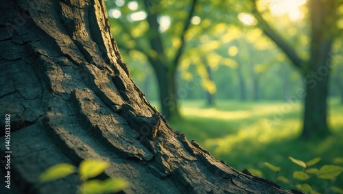Detailed View of Textured Tree Bark with Trees in the Background and Green Leaves