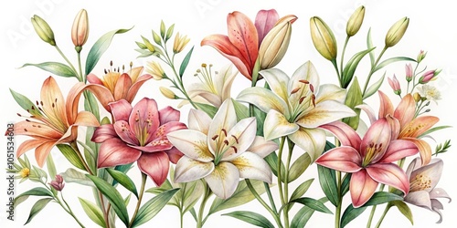 Detailed vintage botanical watercolor of blooming lilies, wildflowers, and delicate leaves, vintage, botanical