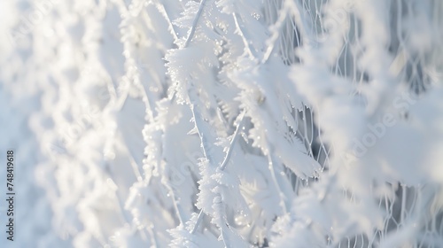 Details metal mesh in the snow fence covered by snow and hoarfrost Beautiful white fence net snow outdoors in winter closeup : Generative AI