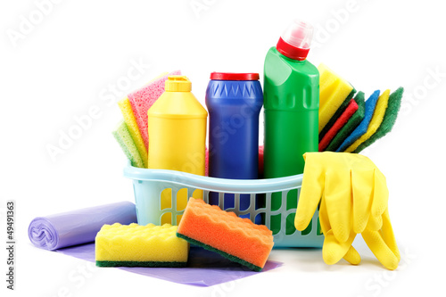 Detergent bottles, rubber gloves and cleaning sponge on a white