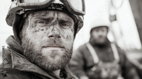 Determination in Industry: A grizzled construction worker, face etched with the grit of labor and resilience, stares intently at the viewer, a testament to dedication and fortitude.