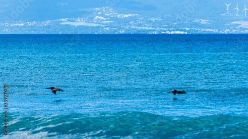 Deux pélicans chassant au-dessus d'une mer bleu intense et un ciel bleu totalement dégagé sur fond de montagnes du massif de la Soufrière en Guadeloupe où sont implantées des éoliennes.