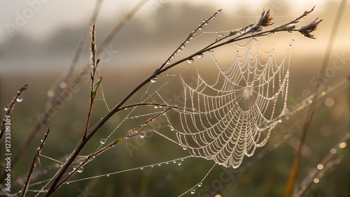 Dew-Covered Spiderweb in Morning Mist
