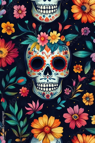 Dia de los Muertos floral illustration with decorative sugar skulls.