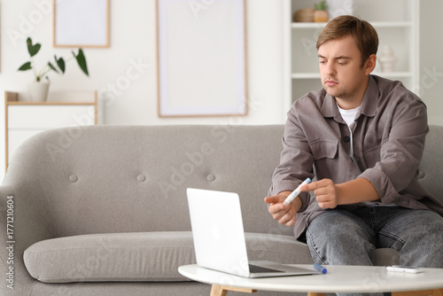 Diabetic young man with lancet pen receiving online consultation from doctor at home