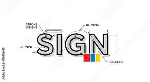 Diagram showing word SIGN design elements: kerning, stroke weight, baseline, color palette Illustrates typography principles for sign creation