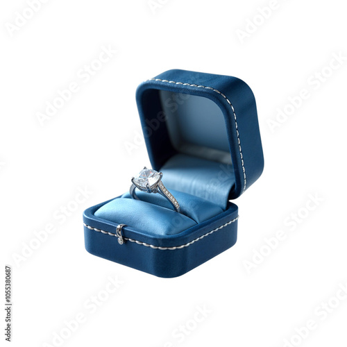 Diamond silver ring in blue gift box isolated on transparent background. Jewelry gift box with ring png