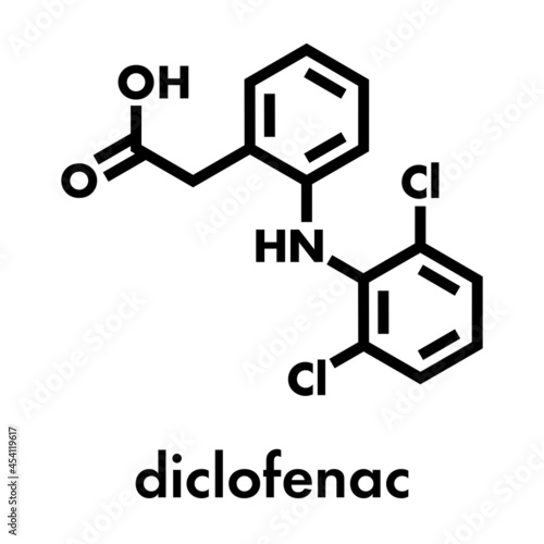 Diclofenac pain and inflammation drug (NSAID) molecule. Skeletal formula.