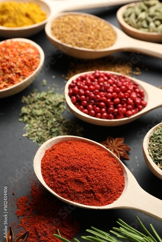 Different aromatic spices in spoons on black table, closeup