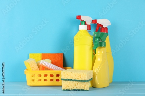 Different cleaning products and supplies on light blue wooden table