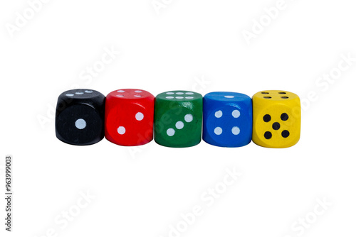 Different colored dice isolated on white background. Five bright colors.