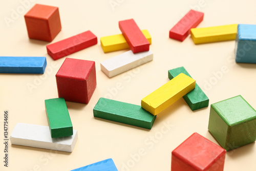 Different colorful building blocks on color background