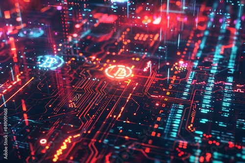 different cryptocurrency coins against a tech binary abstract background, combining digital currency symbols with streams of binary code, showcasing the intersection of technology and finance