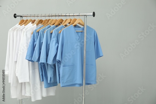 Different medical workers' uniforms on clothing rack against grey background. Space for text