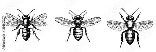 Different species of bees depicted in intricate black and white illustrations showcasing their unique features and anatomy