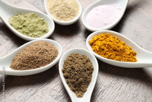 Different superfood powders in spoons on wooden table, closeup