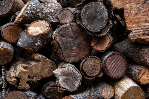 Different types of ecological wood logs stacked ready to burn, for barbecue or for the fireplace