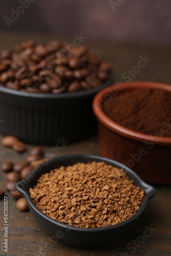 Different types of instant coffee and beans in bowls on wooden table against brown background, closeup