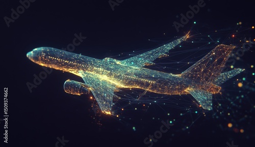 Digital airplane in flight. Abstract representation of a commercial jet, composed of glowing particles and lines, highlighting the interconnected technology of modern air travel