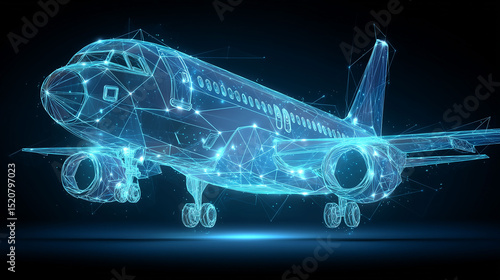 Digital airplane in futuristic technology style. Polygonal holographic airplane. AI innovation in air transport industry. Abstract background