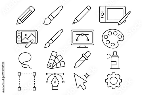 Digital art tools icons set featuring brushes, pens, tablets, and color palette