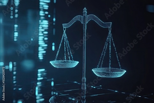 Digital balance scale, glowing binary code, blue cyber scales, futuristic justice symbol, computer screen background