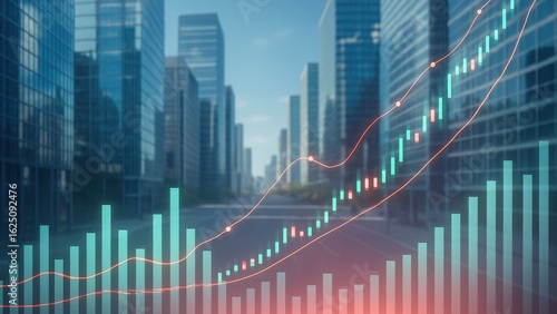 Digital charts overlay city buildings with graphs rising upward in clear sky, blending finance and tech, Virtual Charts, Success Arrow