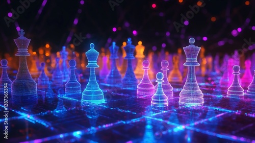 Digital Chess Game. Strategy And Tactics Concept. Abstract, Futuristic 3D Render. Neon Colors.