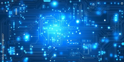 Digital Circuit Board Technology Background, Abstract Tech Design With Glowing Lines And Nodes