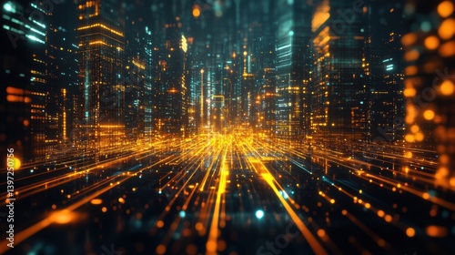 Digital Cityscape with Glowing Light Trails