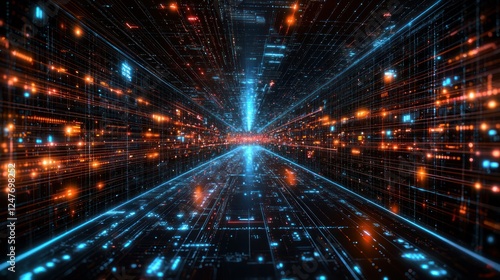Digital data stream tunnel, glowing lines, future tech, network background, website header