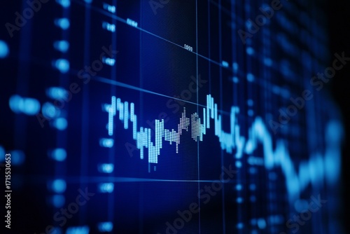 Digital financial chart displaying stock market data with candlestick patterns on a blue screen background