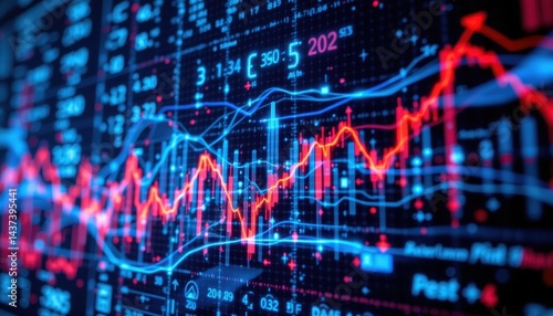 Digital financial market graph concept featuring dynamic blue matrix environment with bold red line bar graphs