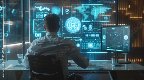 Digital financial planner creating a client strategy using a futuristic virtual interface