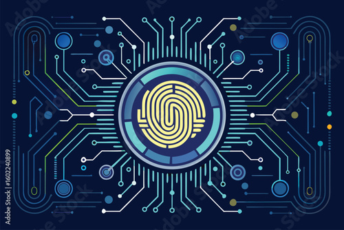 Digital fingerprint design integrated with circuit patterns representing technology and security in a modern setting