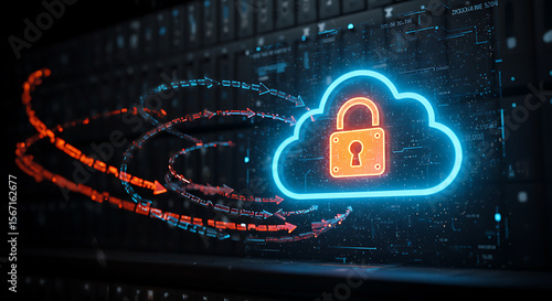 Digital Fortress: An abstract visualization of secure cloud computing, where a digital cloud symbol with a prominent lock, is surrounded by dynamic digital arrows.