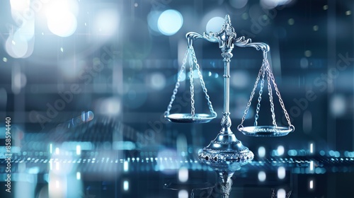 Digital illustration of a balanced scale on a reflective surface, with glowing lines of code in the background, symbolizing justice and technology