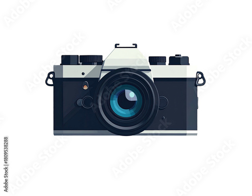 Digital illustration of a vintage, film camera with a prominent lens, set against a black background