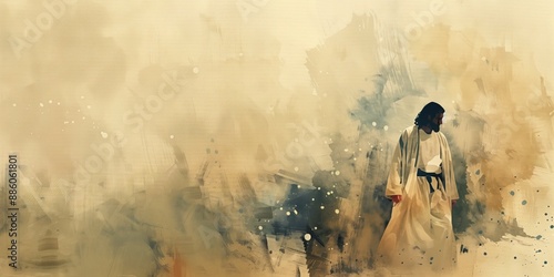 Digital illustration of Jesus Christ walking towards viewer with white cloth. Serene atmosphere created by brown and gray hues in rich green landscape.
