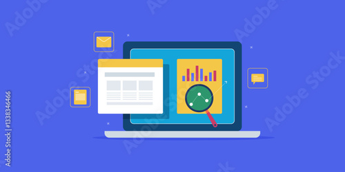 Digital marketing and website performance SEO report on laptop screen, website traffic, user conversion and return on investment e-business concept.