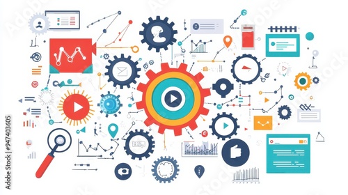 Digital Marketing Strategy Gears Icons and Charts for Business Success