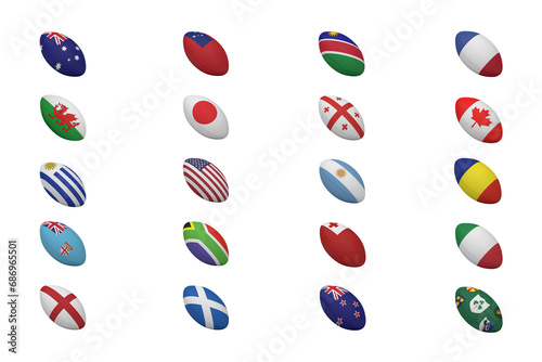 Digital png illustration of rugby balls with flags on transparent background