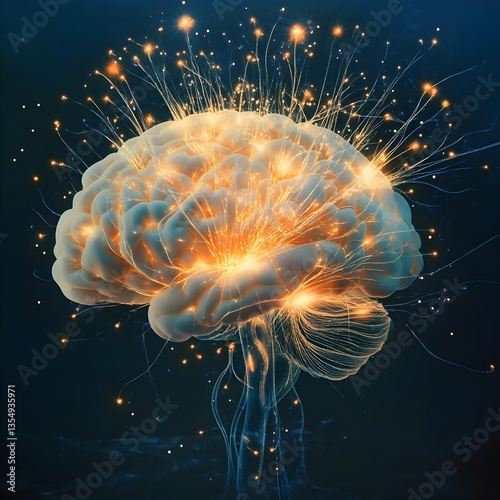 Digital rendering of a human brain with visible electrical impulses and bright flashes against a deep blue background, illustrating neural activity.
