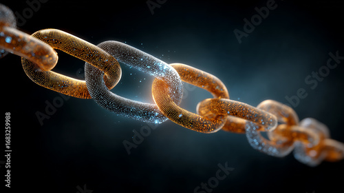 Digital representation of glowing chain links with a futuristic design, showcasing interconnectedness and strength against a dark background