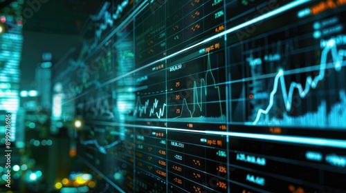Digital screen displaying stock market trends and financial indicators