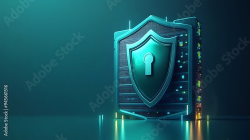 Digital security concept with a shield icon on a server. Bright colors and futuristic design representing data protection and cybersecurity.