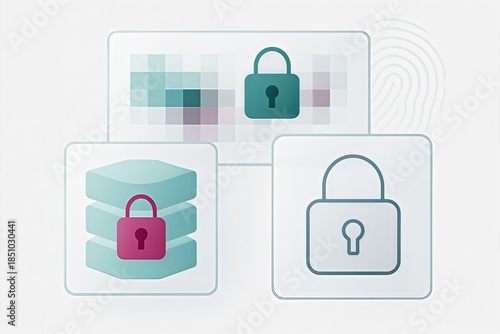 Digital security concepts highlighting data encryption methods with symbolic padlocks and pixelated backgrounds representing privacy protection in technology systems