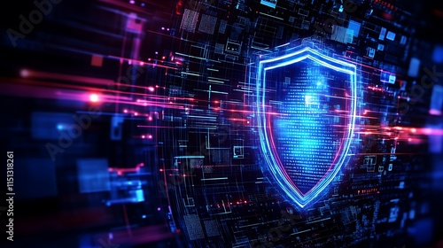 Digital Shield Concept with Abstract Data Patterns and Glow Effects for Cybersecurity and Data Protection Themes